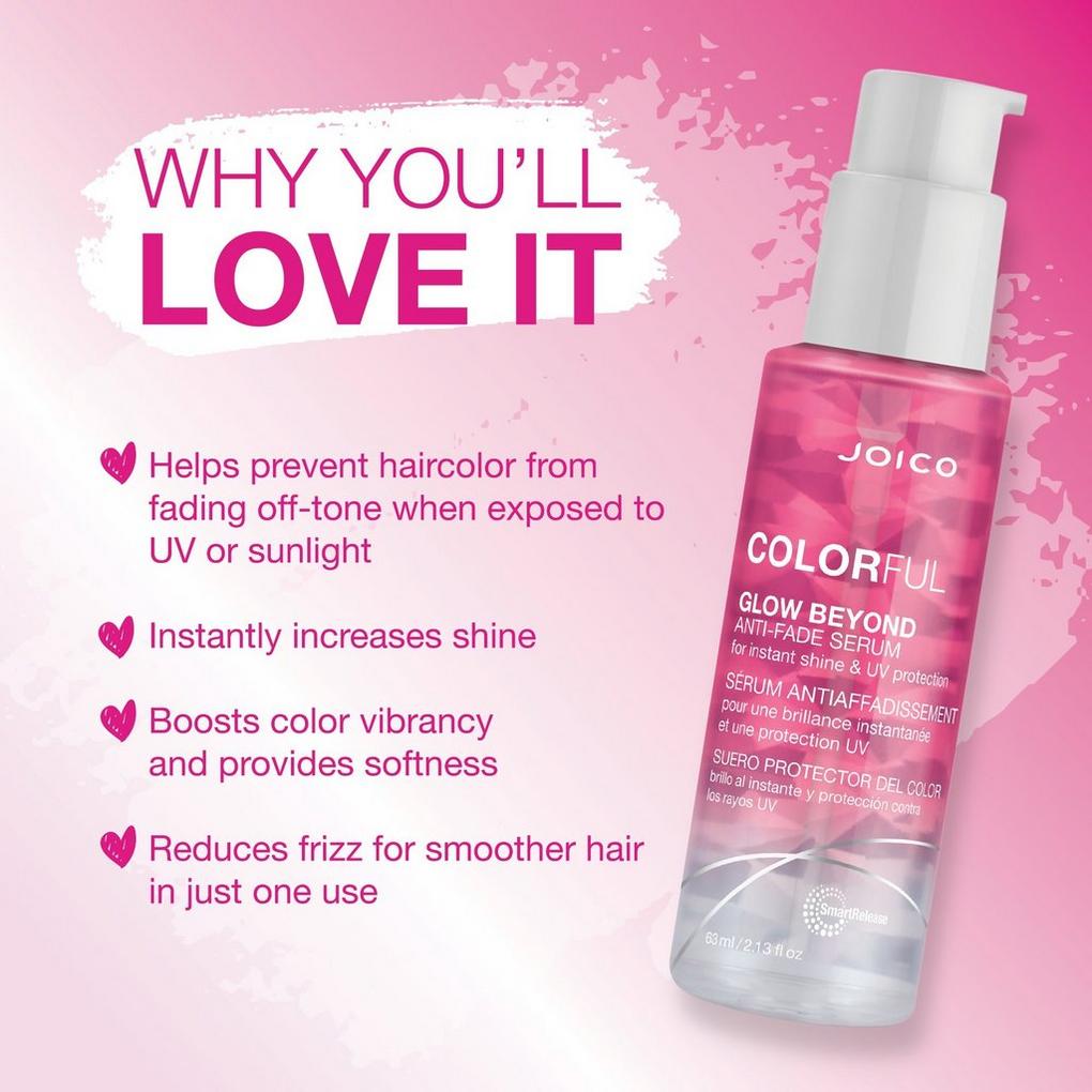 Imagine an instant, noticeable, stunning hit of vibrancy – the kind of punch that boosts the brilliance of hair color. That’s what you get with Glow Beyond, the anti-fade serum that puts the spotlight on radiance, while helping to protect hair against harsh, color-fading UV rays. Formulated with rich Camellia Oil and Pomegranate Fruit Extract, this glossing serum highlights and helps prolong the freshness of fabulous hair color.